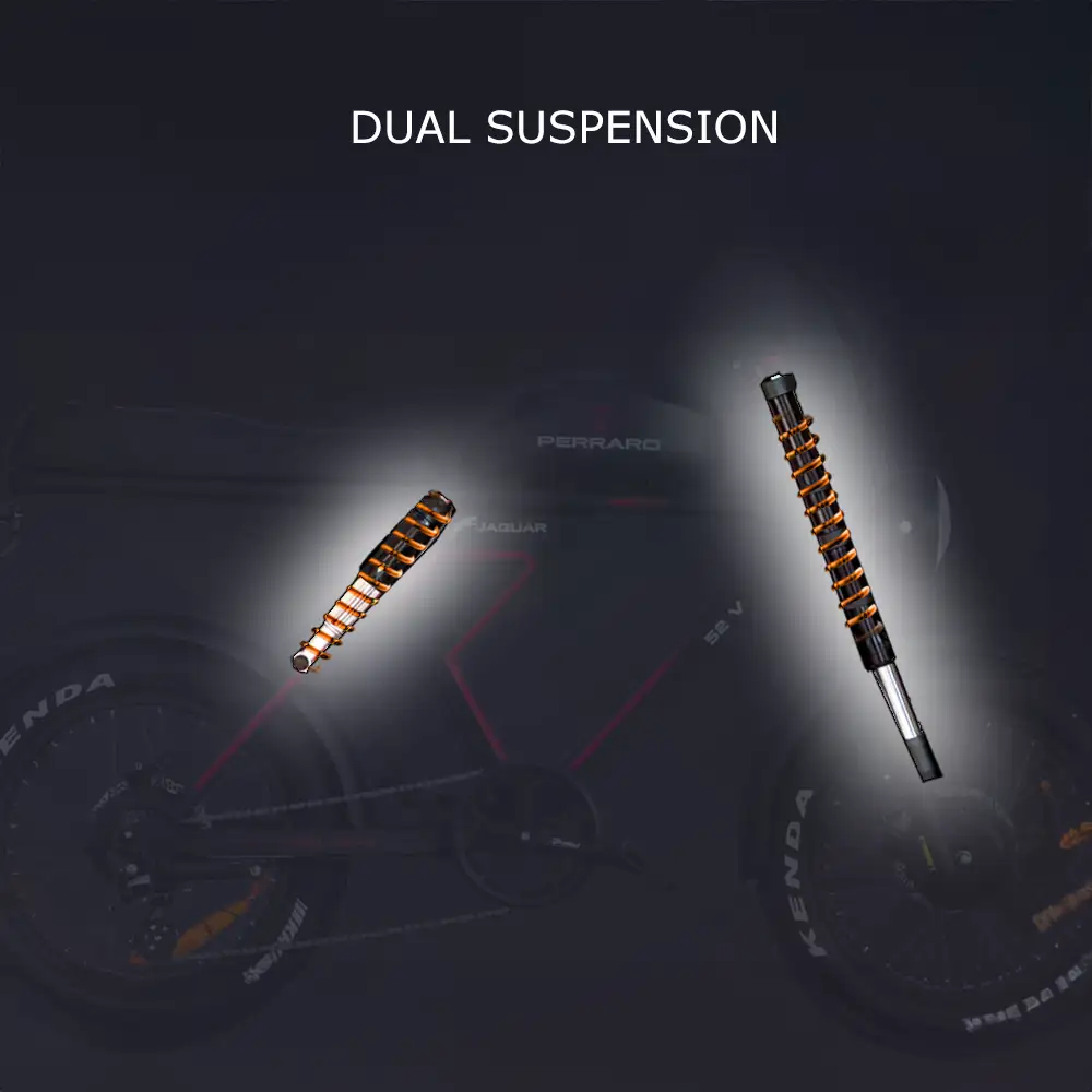 Enjoy a smooth ride with our electric bike's dual suspension system. It softens the impact of bumps and rough terrain, ensuring a comfortable journey wherever you go. Perfect for both adventurous trails and everyday city rides, this bike provides a stable and enjoyable experience, making every trip a pleasure.