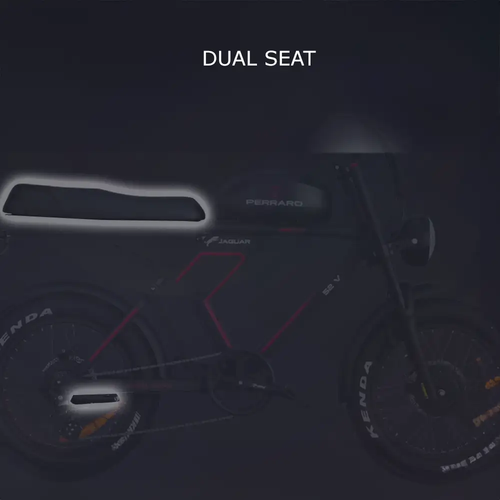 Experience comfort on every trip with the Jaguar eBike's dual seat and footrests, designed for a pleasant ride alone or with someone else. Ideal for casual outings or extended rides, this eBike guarantees a cozy ride for everyone involved.