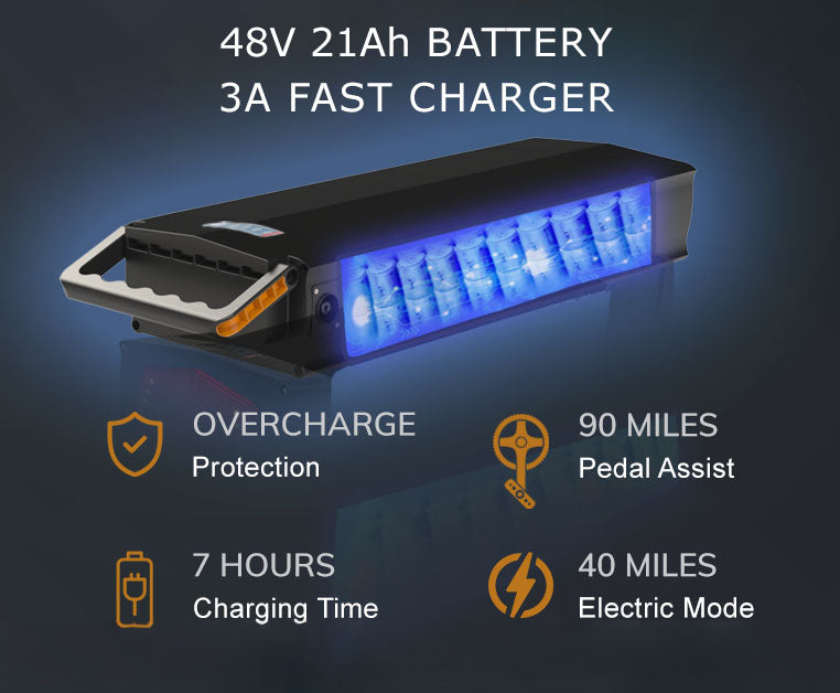 15.6Ah Battery: 60+ miles per charge. 21Ah Battery: 90+ miles per charge. Mileage may vary based on road conditions, rider weight, and riding style.