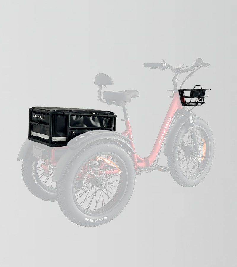 The trike comes with convenient rear and front baskets, perfect for carrying groceries or personal items, and includes a durable waterproof storage bag specifically designed for the rear basket, ensuring your belongings stay dry and secure in any weather.